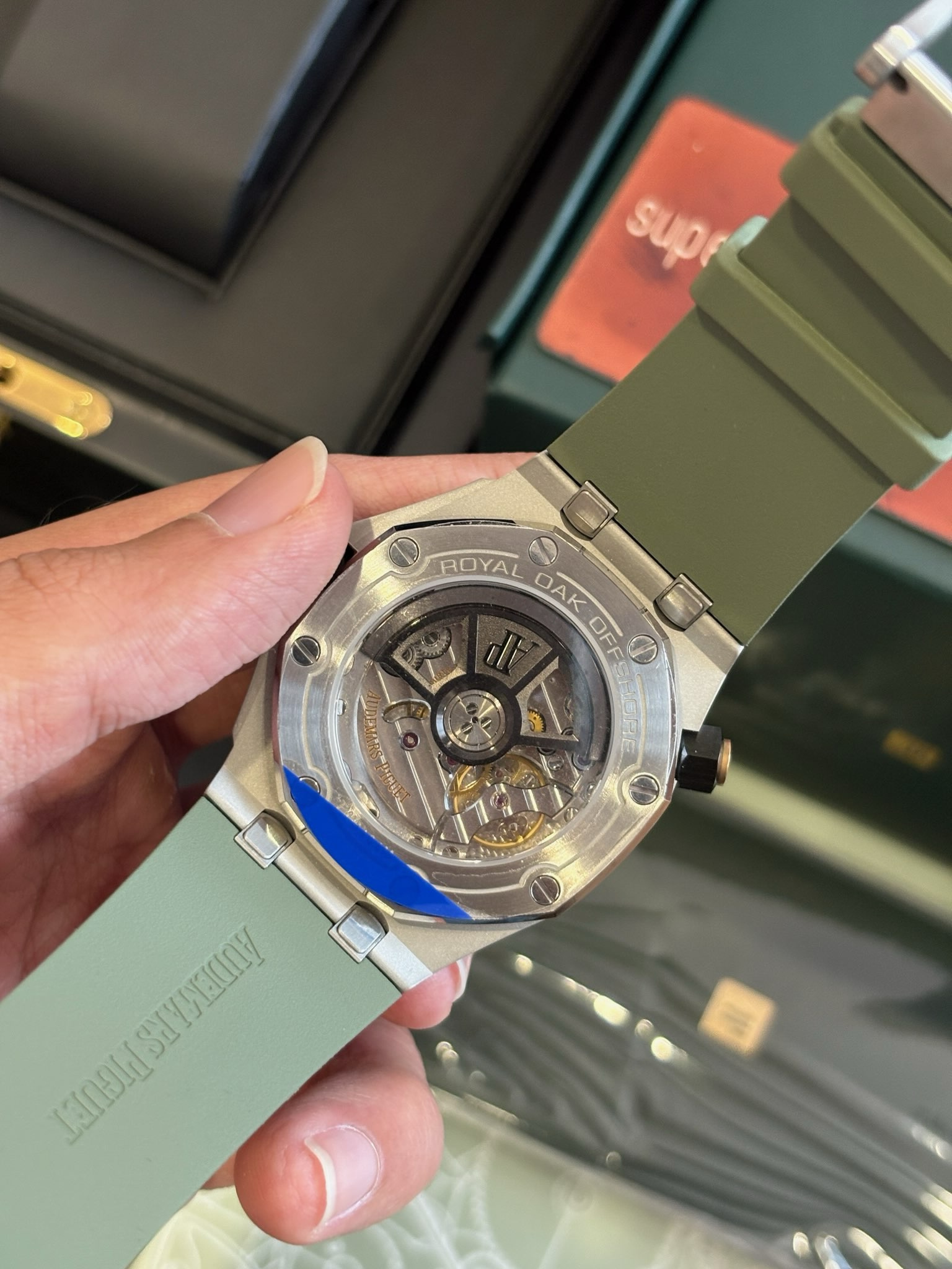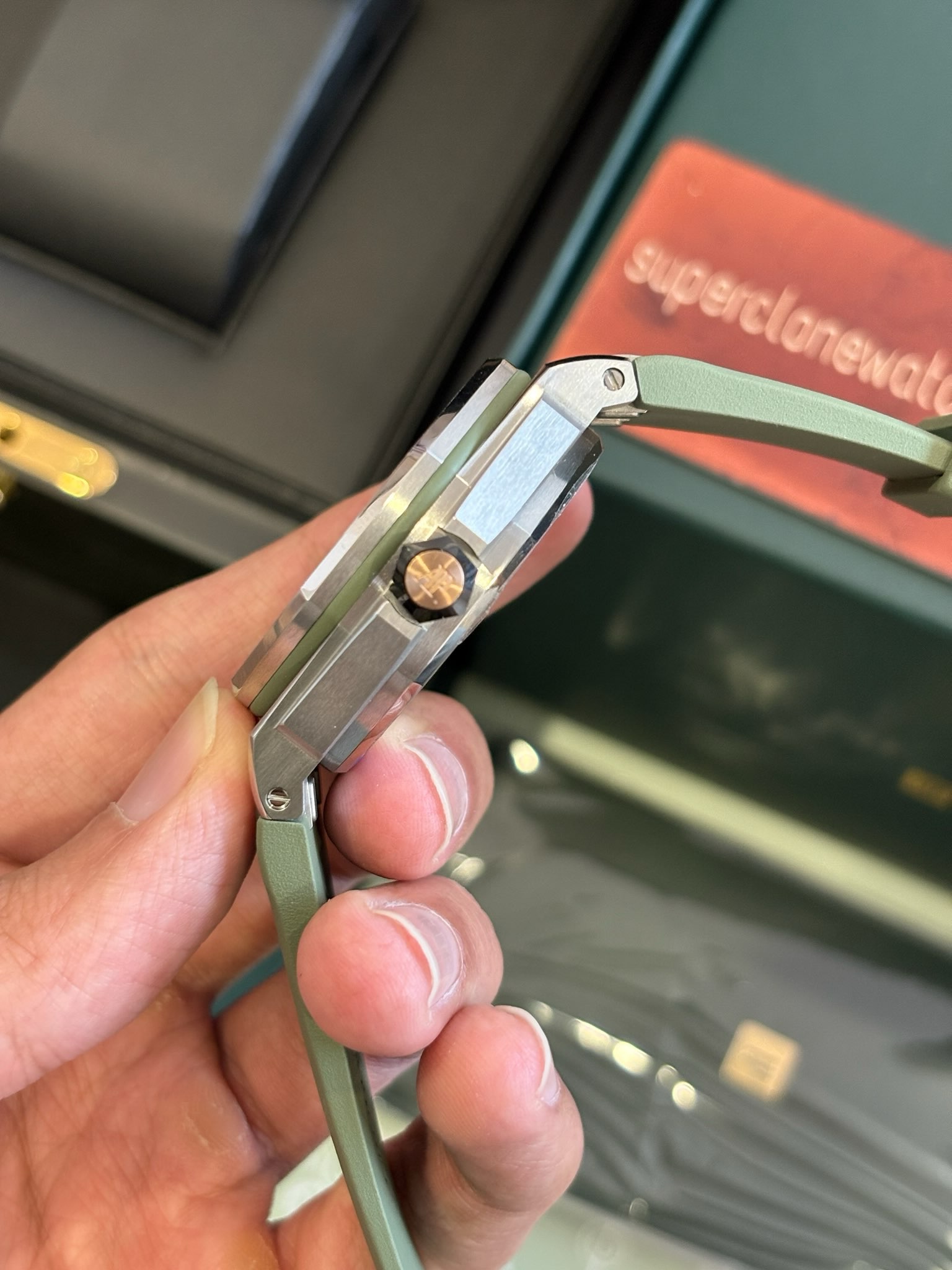 Audemars Piguet Royal Oak Diver Replica come with diver bezel & dive bezels are intuitive to look at, easy to read & more useful than typical Chronographs. The dial features a mega tapisserie Dial with black lacquer gloss white Gold indices & hands faceted for contrast & something you won’t find on an Offshore Chrono Replica. A flush date disc which sits underneath the dial side magnifier as there is no moduler complication no tunnel down to date known as screw down crown, both crowns are screw down crown. The Watch features both hacking seconds a you could see and a quick set date that allows you to rapidly cycle the dates & the watch run down or encounter the regular month. The most important part of a Swiss clone Ap watch is the cloned movement, that’s where all the money is! Green AP Royal oak Offshore diver REF: 15710ST features a Swiss cloned 3120 caliber movement, guaranteeing a 48 hour power reserve, the real one promises power reserve of 60 hours. Bi-directional winding for smoothness with unlubricated ceramic bearings. This Cloned 3120 movement was designed for offshore launched in 2005 with a full balance bridge & free spring index for shock resistance, to better take and hold precise regulations when bumped & concussed. Best Audemars Piguet Royal Oak Offshore diver olive green replica beats away 21600 Vibrations per hour