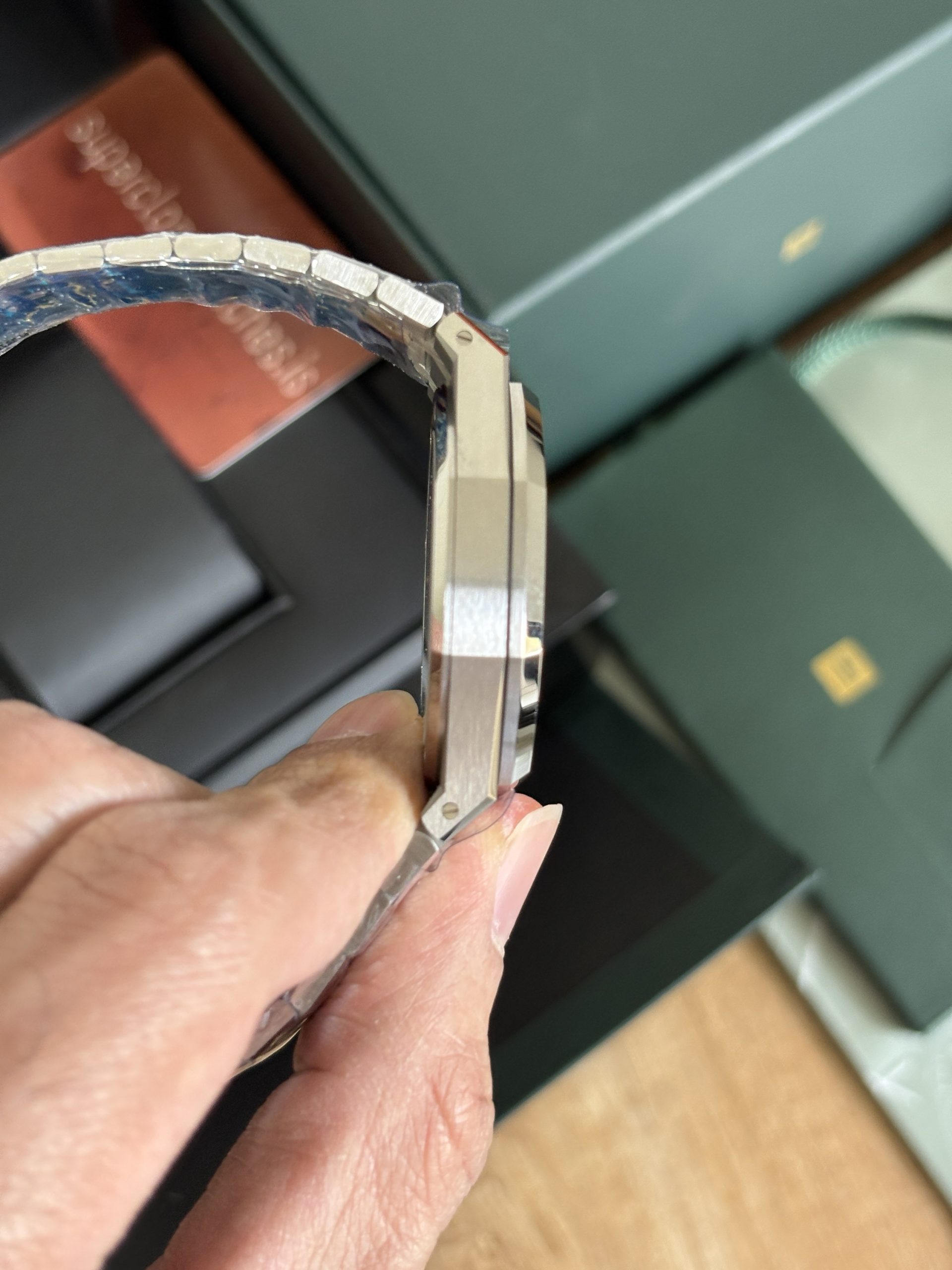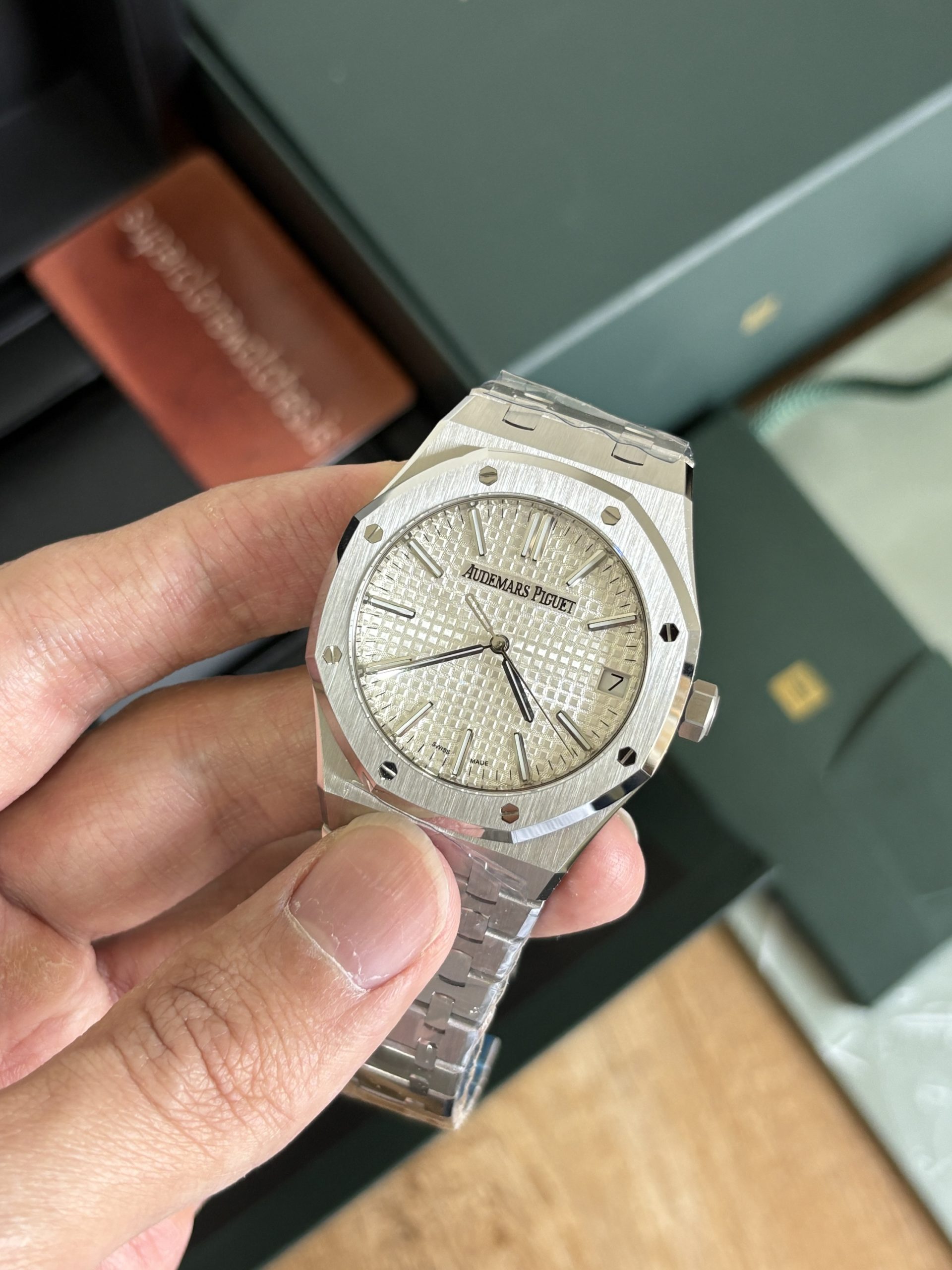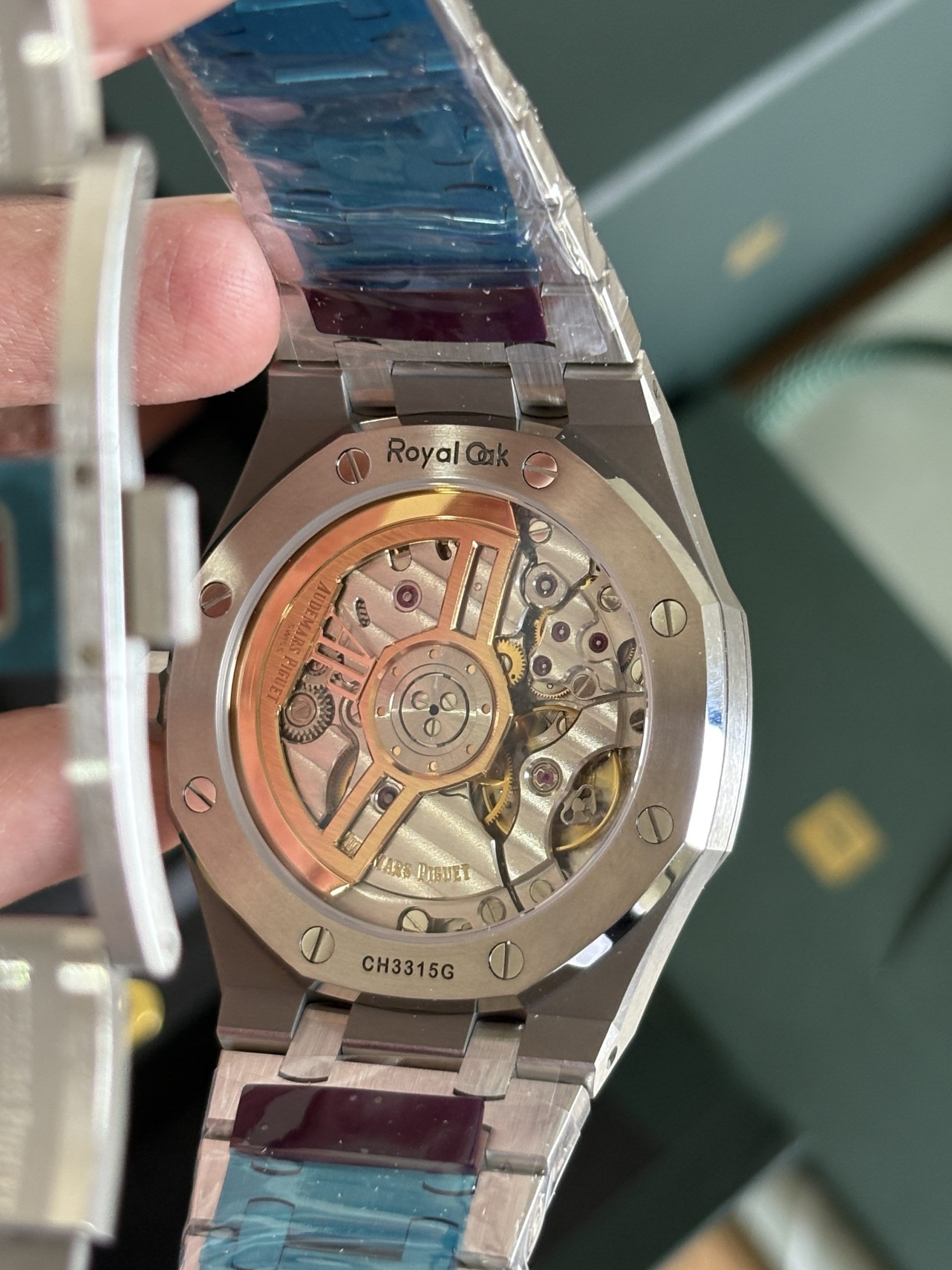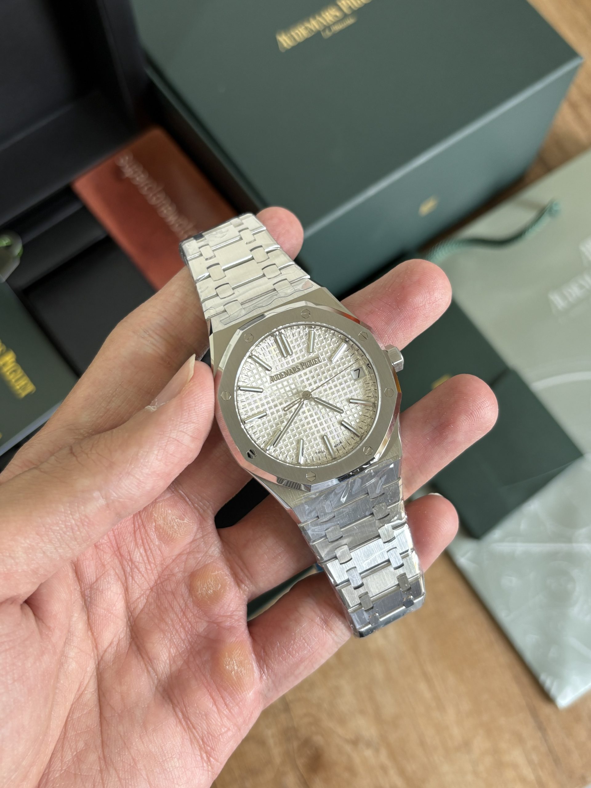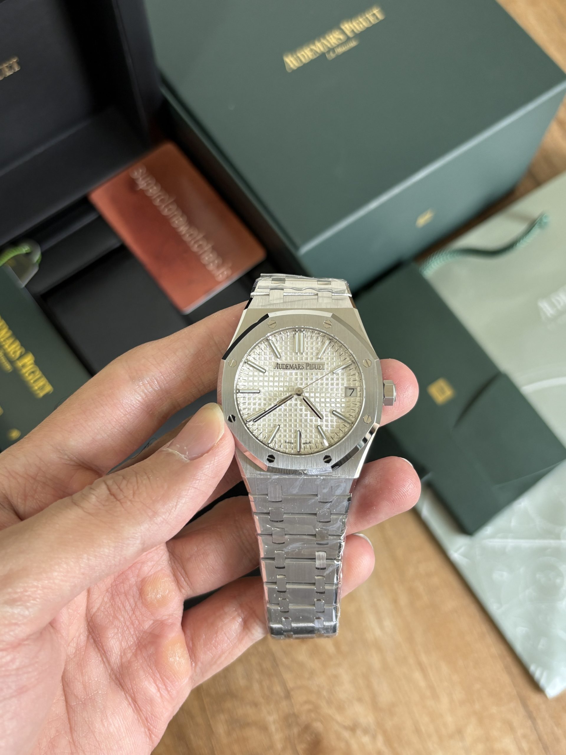 Clone Ap Royal Oak 15510 is successor to 15500 reference. In latest generations Ap has made the dial further minimalistic, if you compare it from Ref 15400, text “AUTOMATIC” doesn’t exist in ref 15500 and 15510. Horologists missed the text “AUTOMATIC” in the following generations, “AUTOMATIC” also carried a great significance on the dial of royal oaks historically when royal oak was the watch that revived the brand Audemars piguet in times of QUARTZ crisis. Compared to predecessor of this 15510 generation AP has further made the dial minimalistic by removal of the AP logo at 12 O Clock position. On the brighter side, the “Audemars Piguet” at 12 o clock that used to be painted on dial in previous generation. In this series, it’s replaced with embossed stainless steel. One admirable difference compared to previous gen is the return of thinner and longer hour indices. The longer and thinner hour indices produce an overall harmony of dial with overall watch design. For the year 2022, AP produced the Ref 15510 with 50th anniversary carved on the rotor, which is now discontinued in favor of the standard Ap rotor. The 15510 produced from 2023 onwards just had one difference from the 2022 50th Anniversary ref 15510 and that is the rotor no longer has 50 years carved on rotor. On the wrist this watch feels like dream if you are someone who appreciates watch with wrist presence. The bracelet is beautiful and the play of light from the bracelet is an experience of it’s own. Due to blingy nature it’s not a subtle watch rather it gives more of a jewelry vibe on the wrist. If you are after a subtle, understated super clone watch than ap royal oak super clone is not for you.