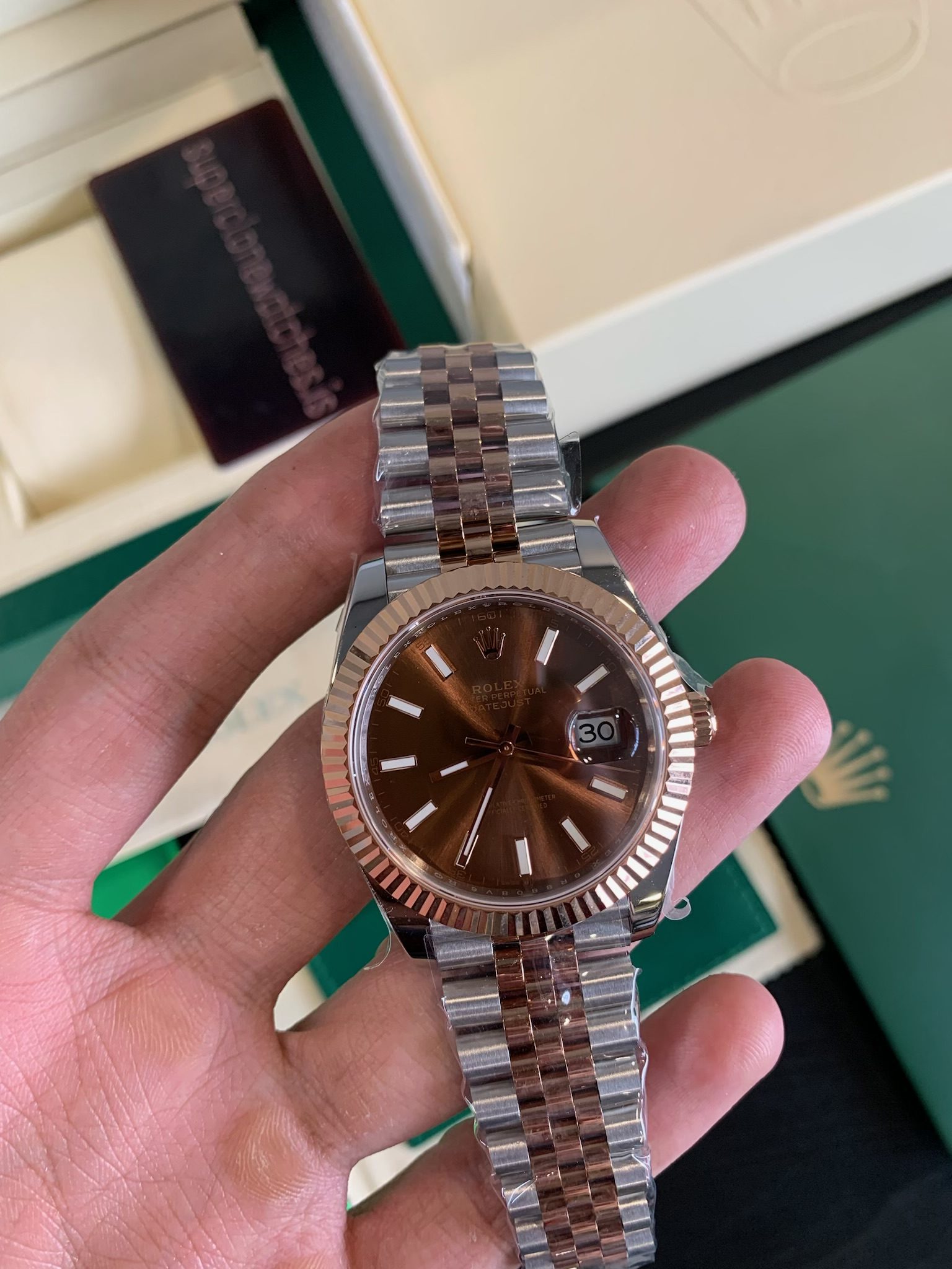 Top Quality Rolex Datejust Ref.126331 Super Clone in 904L Stainless steel and Everose gold features a chocolate dial and an Oyster bracelet.